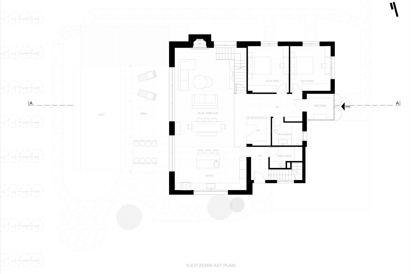 İç mekanlarda geniş ve ferah alanlar sunulmuş, kullanıcıların rahatça vakit geçirebileceği sosyal alanlar tasarlanmıştır. Şömine ile sıcak bir atmosfer yaratılmış, açık mutfak adası ve büyük masa, kullanıcıların bir araya gelmesine olanak tanımaktadır. Tavan yüksekliği, doğal ışık kullanımını, iç mekanlarla doğa arasındaki bağı güçlendirmiştir. Havuz manzarası ve sonsuz bağ görüntüsü, yaşam alanlarına estetik bir dokunuş katmaktadır.