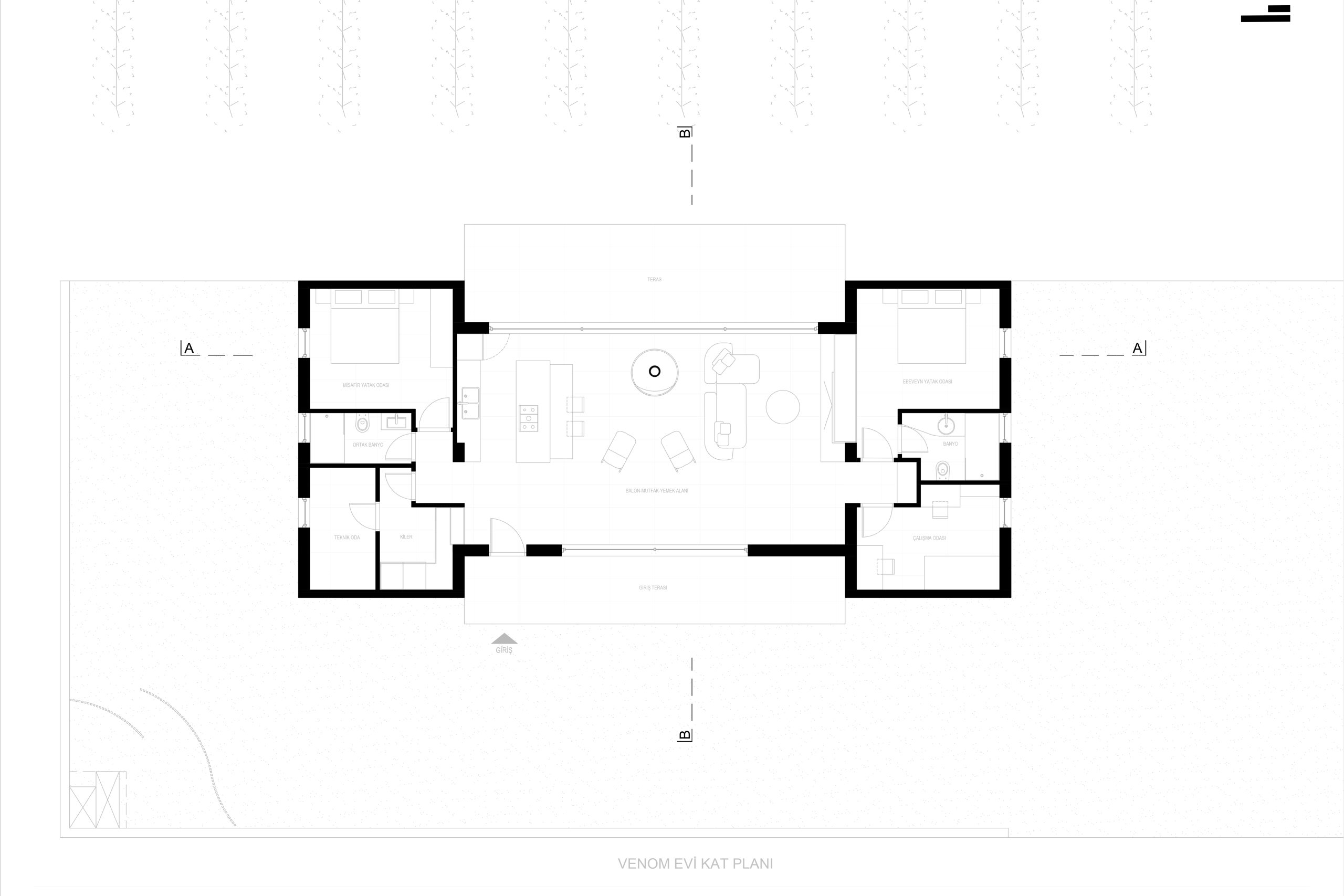 Evin ana mekânsal kurgusu, bir ebeveyn odası ve bir misafir odasının ortada yer alan ortak yaşam alanı olan salonla birbirine bağlanmasına dayanır. Tasarımda m² hesabı titizlikle yapılarak minimum alan kaybı hedeflenmiştir. Salonun 9 metrelik geniş cam panelleri, bağ ve manzarayı içeri alarak iç ve dış mekan sürekliliği sağlamaktadır.